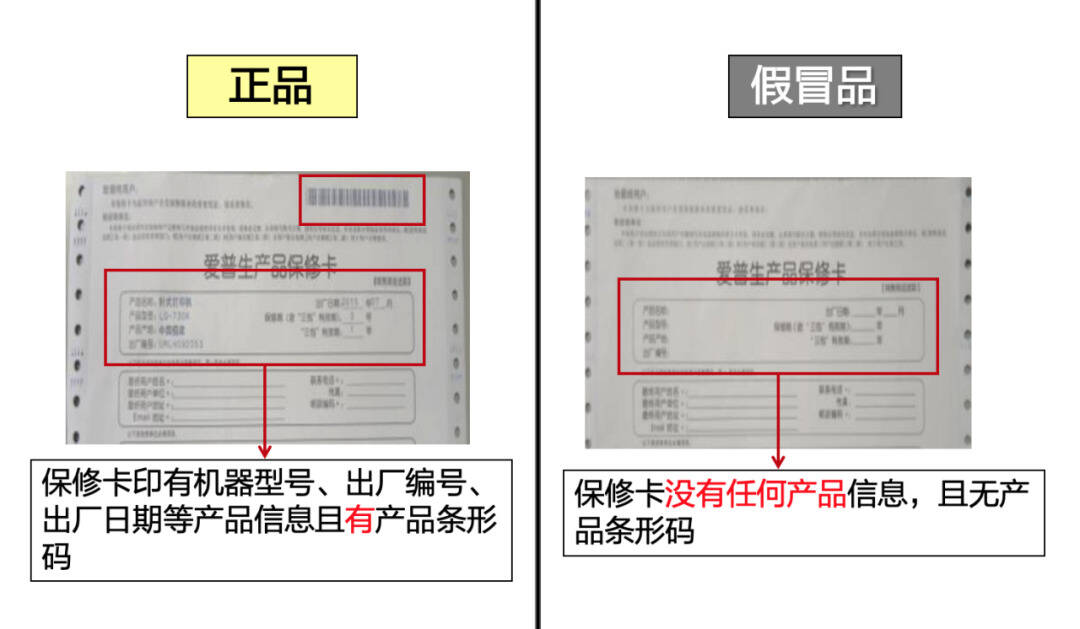 正品的保修卡上都会印有机器型号,出厂编号,出厂日期等产品信息且有产品条形码。假冒产品的保修卡没有任何产品信息,而且没有产品条形码。