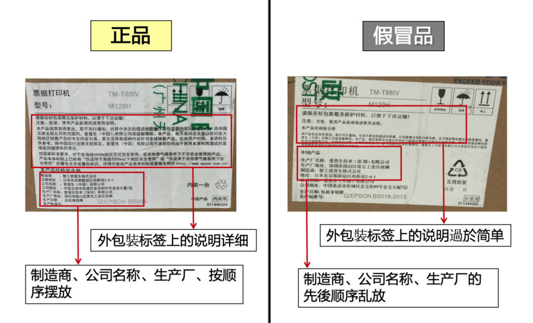 正品爱普生微型打印机在外包装标签上的说明详尽,并包含相关法律条例的阐述和适用条件,此外,制造商、注册地址、公司名称等信息都会按顺序摆放。反观假冒产品,外包装标签上的说明过于简单,且制造商、公司名称、生产厂信息先后排列顺序混乱。