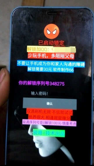 用另一部手机打电话给那部被锁的手机,然后出现接电话那个界面,然后马上退出到桌面,找到锁机软件直接删了。
