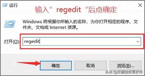 2.在“打开”右侧框内输入“regedit”并按下回车键或者点击确定;