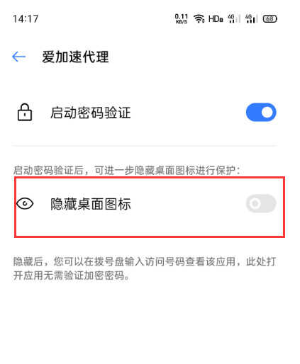 5、进入跳转的界面后,点击“启动密码验证”后,把“隐藏桌面图标”打开即可。