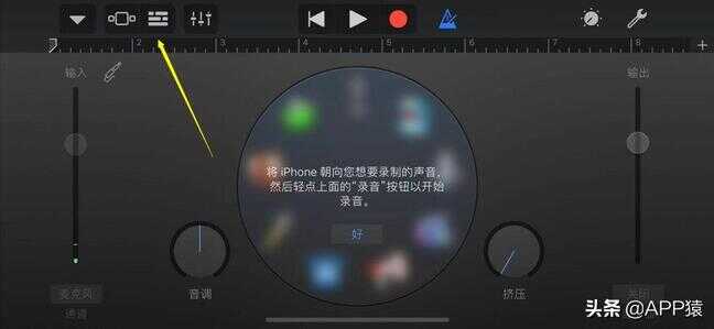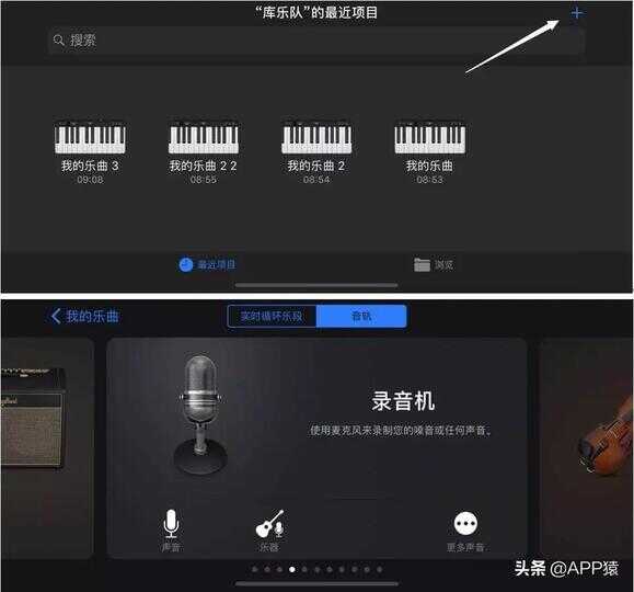 1、打开库乐队,点击右上角的 + 号,横向滑动屏幕选择「录音机」功能。
