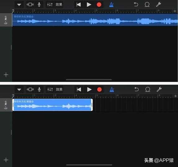 6、编辑完成之后,点击左上角的倒三角形按钮,即可将编辑后的音乐文件保存到「库乐队」的最近项目中。
