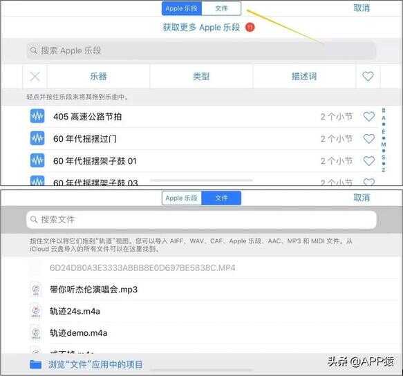 4、在弹出的界面上方,我们可以看到「Apple片段」和「文件」两个目录,我们点击选择「文件」目录,就可以看到保存在手机里边的音乐文件了。