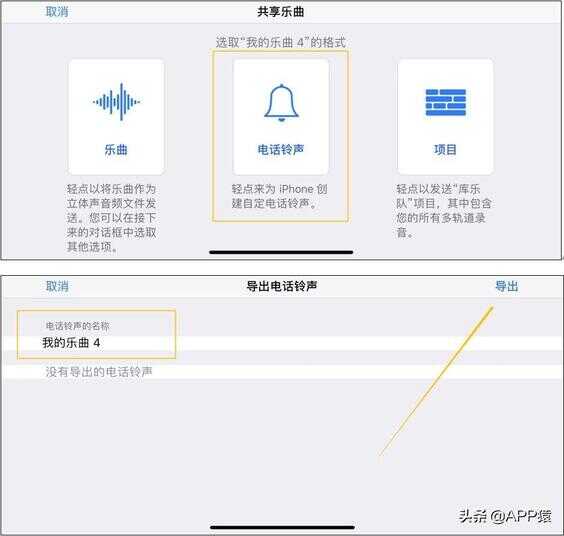 8、如图,点击中间的「电话铃声」,设置一下铃声名字,点击右上角的导出按钮,就可以将该音乐存储至电话铃声库了啦。