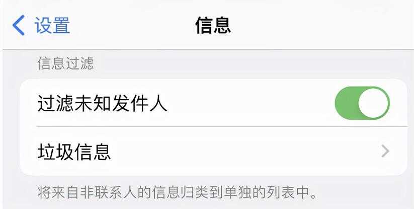 如果你平时会使用「iMessage 信息」,那么我们可在手机的设置—信息,然后将下面的「过滤未知发件人」开启,不过这样只能屏蔽部分 iMessage 的垃圾信息。