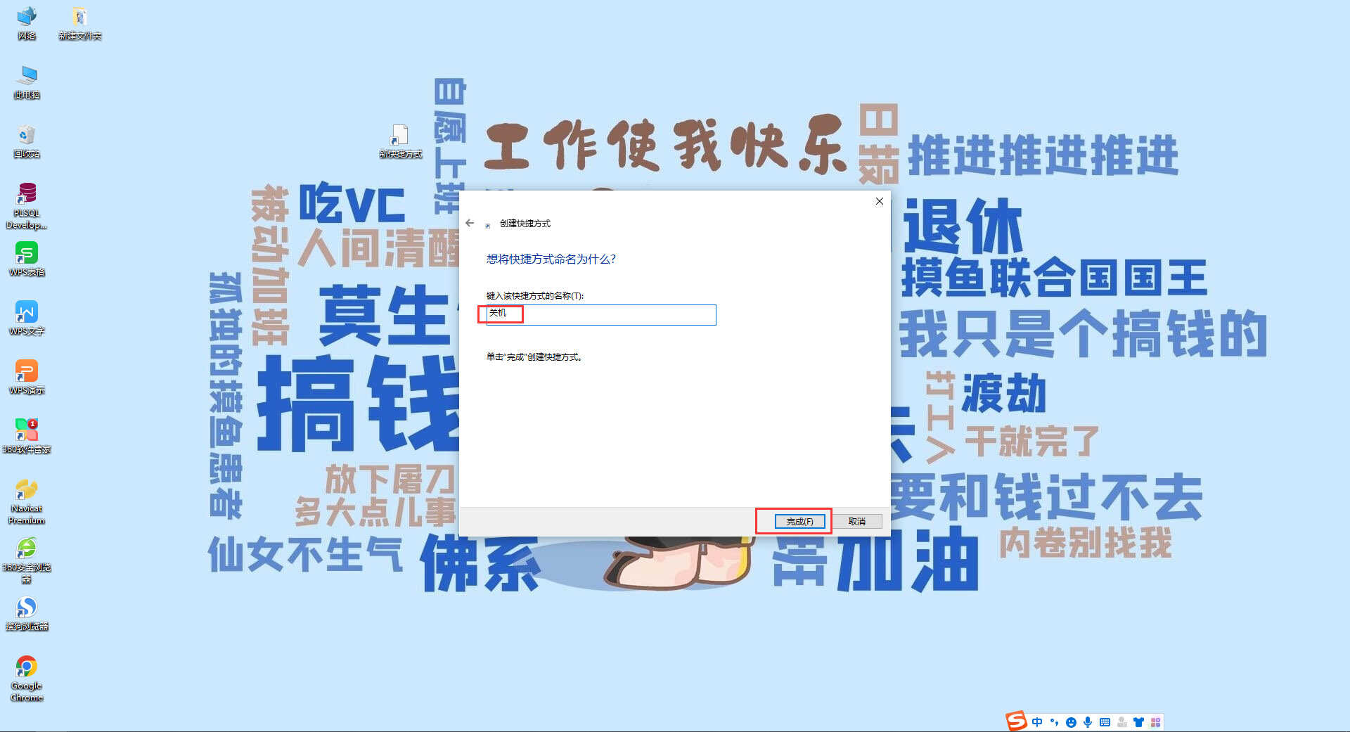 2、改成关机,点击完成,桌面就生成一个关机的快捷方式,如下图;