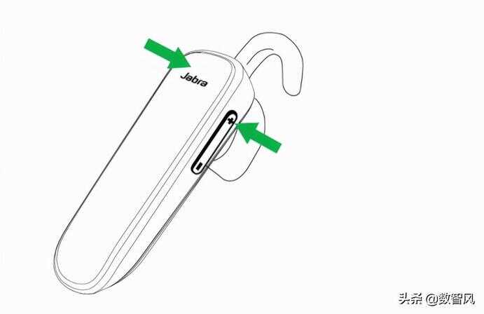 ①、将Jabra Boost开关向上滑动到“开启”状态(电池图标侧)。同时按住音量+按钮和多功能按钮(jabra文字) 5 秒钟,直到电池和蓝牙指示灯闪烁。