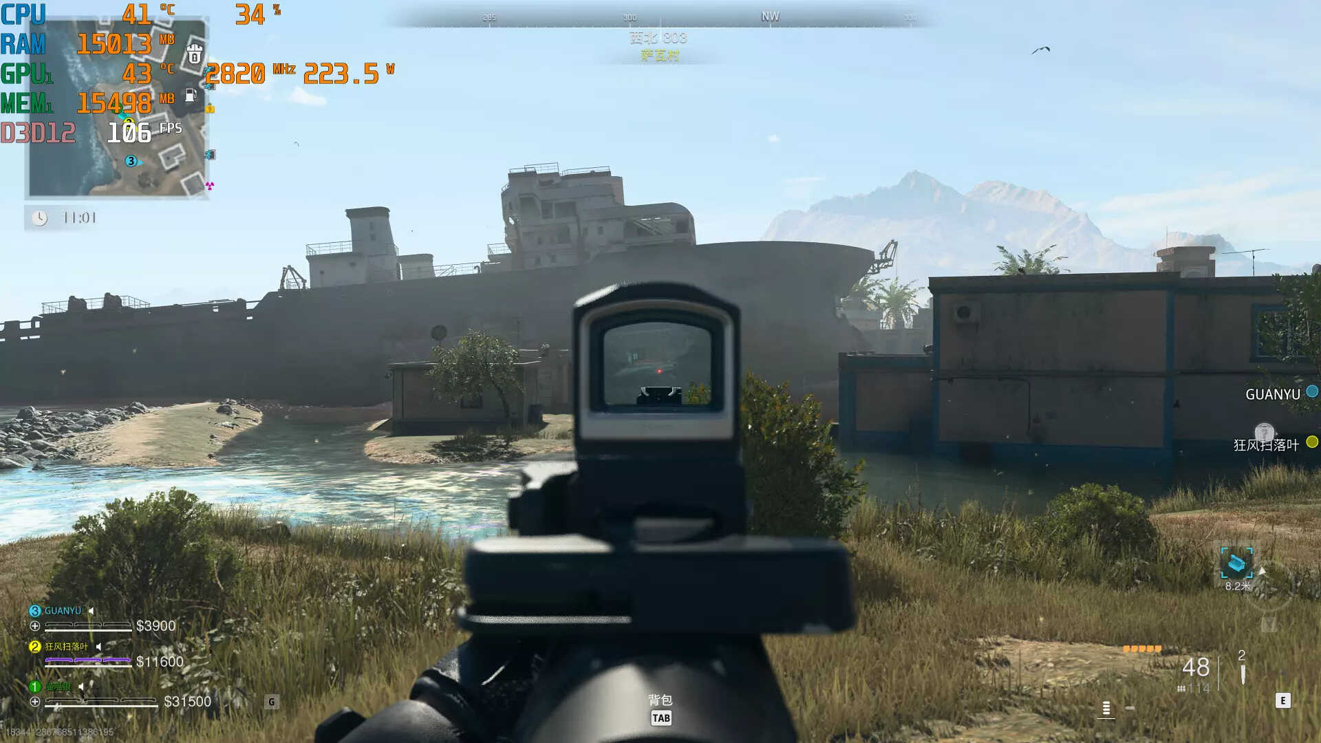 除了跑分,高频内存究竟能不能提升游戏?我就拿最近流行的FPS游戏《使命召唤:战区2》进行一个测试。因为显示器是微星MPG321UR-QD,所以游戏都是设置4K分辨率,最高画质、DLSS开启平衡模式。