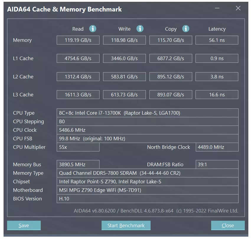 进一步微调电压和小参,我最终将阿斯加特博拉琪BRAGI DDR5内存超频到了7800MT/s,也就是提高了1000MT/s,届时时序为34-44-44-60 CR2。性能方面,读取速度达到了119.19GB/s,写入速度达到了118.98GB/s,复制速度达到了115.70GB/s,延迟再次降低,仅为56.1ns。