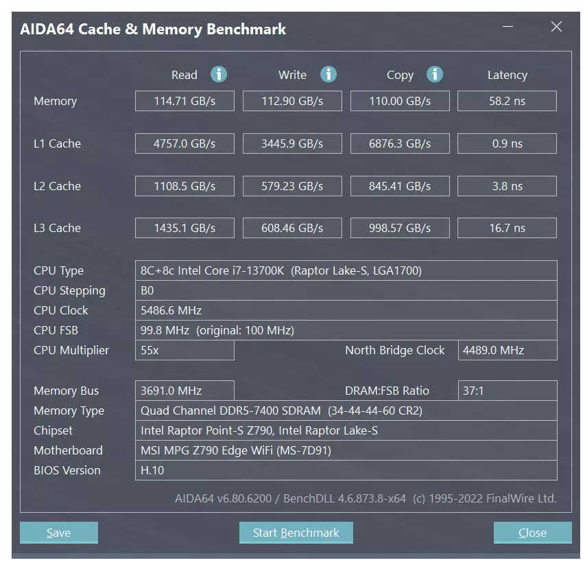 6800MT/s当然也不是阿斯加特博拉琪BRAGI DDR5内存的极限,微调电压和时序后,就开始进一步超频作业,先来个7400MT/s小试牛刀,性能再次全面提升:其中读取速度达到了114.71GB/s,写入速度为112.9GB/s,复制速度也有110.GB/s,延迟更是降到了58.2ns。