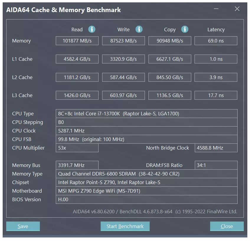 接着开启XMP,阿斯加特博拉琪BRAGI DDR5内存的频率升到6800MT/s,届时时序为38-42-42-90,这时候读取速度突破了100GB/s大关,达到了101877MB/s,写入速度为87523MB/s,复制速度为90948MB/s,延迟降到了69ns。