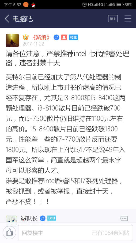 良心的电脑吧甚至防止JS炒存货,强禁为吧友推荐7代cpu,可见这次牙膏厂对整个组装圈的影响,囤了7代cpu的商家哭晕在厕所,谁能想到这次牙膏厂挤了这么多?
