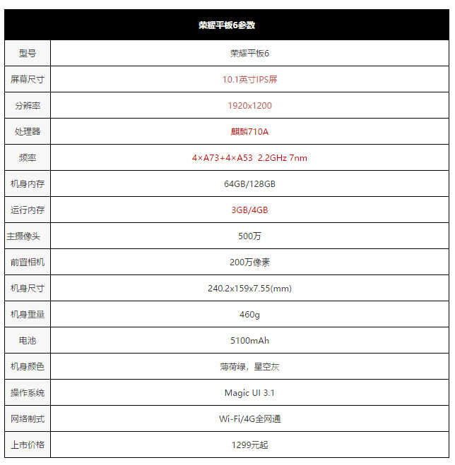 荣耀平板6采用一块10.1英寸屏幕,提供全高清的1920x1080分辨率,使用IPS屏幕,搭载麒麟八核高性能处理器,并且拥有大振幅扬声器立体声以及HUAWEI Histen 6.1音效技术。储存方面,荣耀平板6提供3GB/4GB的运行内存,还有64GB/128GB的机身储存,并且支持SD卡扩展内存。荣耀平板6提供5100mAh大电池,可惜没有提供快充支持。荣耀平板6提供了Wi-Fi版和4G全网通版。