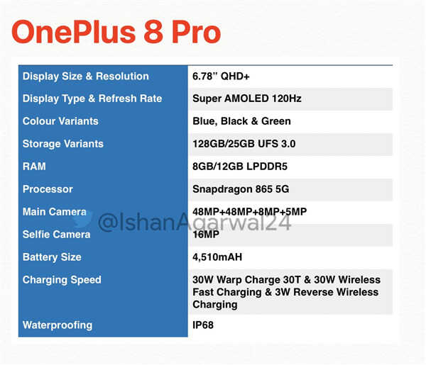 一加8 Pro采用6.78英寸2K+显示屏,刷新率为120Hz,搭载高通骁龙865旗舰平台,配备8GB/12GB LPDDR5内存及128GB/256GB UFS 3.0闪存,后置4800万+4800万+800万+500万四摄,前置1600万像素,电池容量为4510mAh,支持30W闪充、30W无线闪充,支持IP68级防尘防水。
