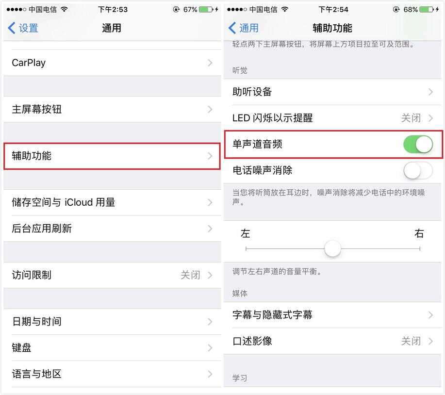 进入【设置】-【通用】-【辅助功能】-【单声道音频】把这个开关打开即可。