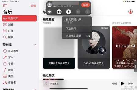 在这里,目前国内消费者最容易接触到的例子,就是跨设备使用Apple Music与好友一起听歌。正如大家所看到的那样,当我们在FaceTime通话的过程中打开Mac、iPad,或iPhone上的Apple Music时,系统就会自动提示是否需要共享音乐。在选择“是”之后,当前处于同播共享状态的多台设备,都会启动本机上的Apple Music应用,并以相同的进度播放相同的音乐。