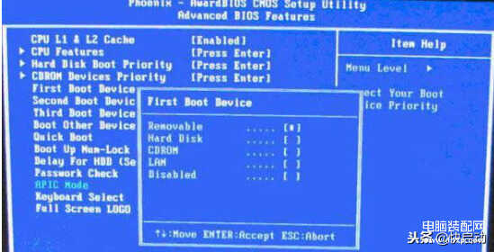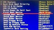 2、在打开的界面中,找到“First Boot Device”然后选中并且按回车键,然后在弹出的小窗口中选择Hard disk。