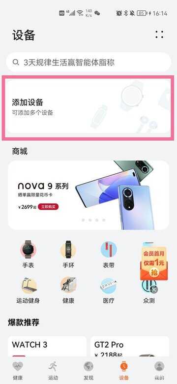 2、打开华为运动健康APP,在设备页点击【添加设备】。