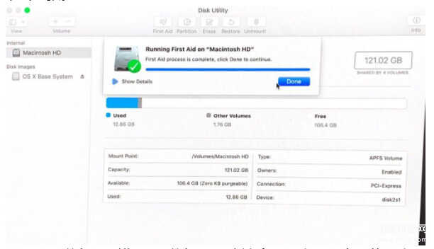 4、如果您的磁盘存在错误,“磁盘工具”应该会找到它们并自动修复它们,或者询问您是否要修复它们。如果是这种情况,请单击修复磁盘。