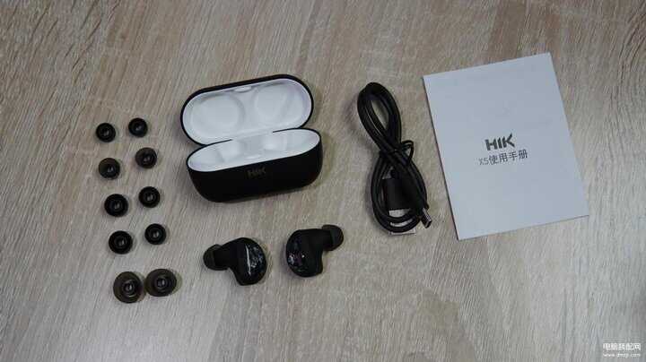 氢刻HIK X5开箱为充电仓、耳机、说明书、Type-C充电线、使用手册各一件,并配备XS、S、L三种尺寸的硅胶耳塞,每种尺寸提供软、硬两种。预安装中号在耳机上,根据自己的耳朵尺寸选择合适尺寸的耳塞即可。