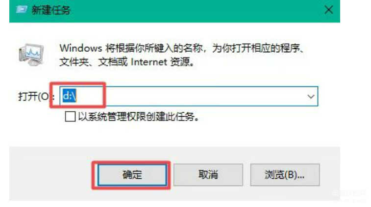 5、然后系统会弹出【新建任务】的窗口,输入【d:】,点击【确定】就可以了。