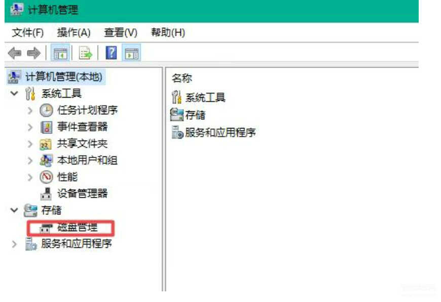 2、在【计算机管理】的窗口找到【磁盘管理】选项,并点击进入。