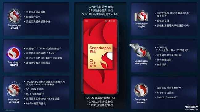 第一代骁龙7提升最明显的反而是外围,它支持4K屏幕和2亿像素的相机,基带升级到X62,外围芯片也从FastConnect 6700升级到FastConnect 6900,增加双频并发功能,理论峰值3.6Gbps。各大厂商的骁龙7机型会在第二季面世,OPPO Reno8 Pro将会首发骁龙7。