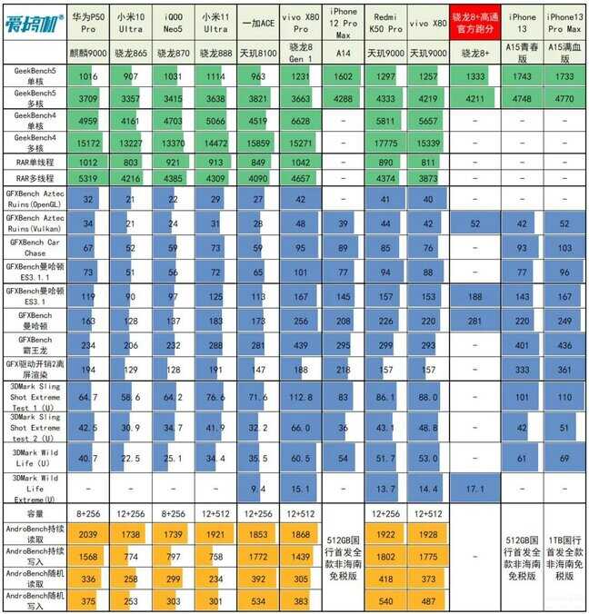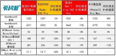 与苹果满血版A15对比,骁龙8+的CPU单核弱30%,多核也差了13%。GFX最高压力的Aztec Ruins测试中战平A15,低压力的GFX测试中强10%左右。