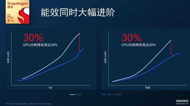 当然,大家更关心的是CPU中低负载下的功耗。就算GPU性能顶天,大家也不会无时无刻玩游戏。骁龙8+换了工艺,有了提频空间,同性能功耗就能下降30%,峰值性能又有明显提升。