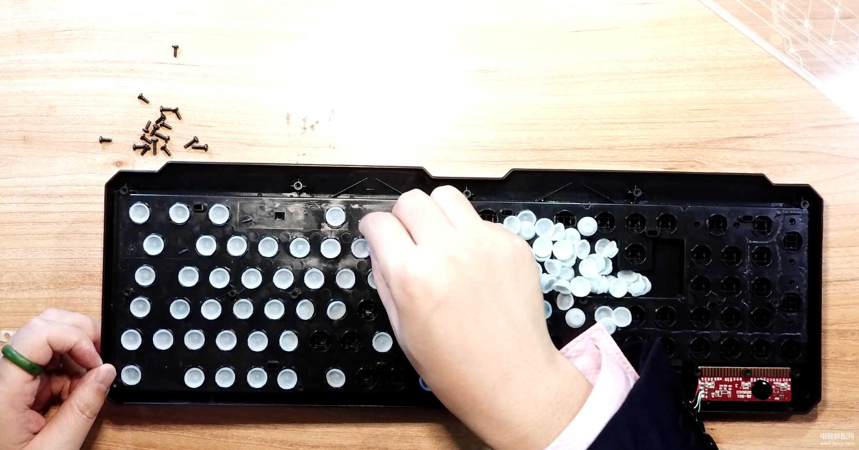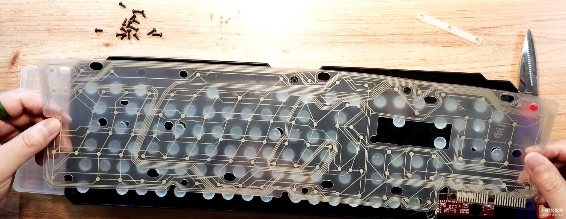 拿出这个薄膜,将它擦干净(薄膜键盘就是因为有这层膜,有别于机械键盘)。▲