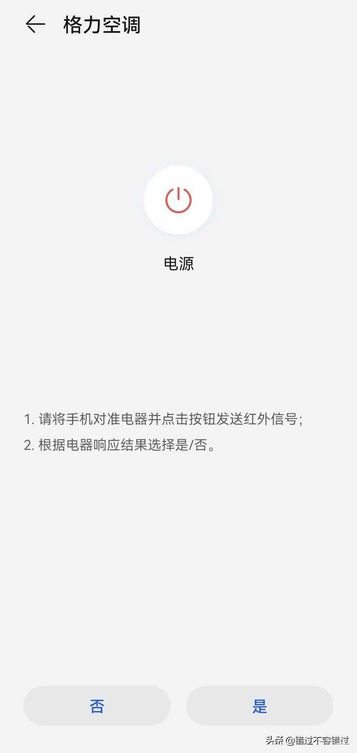 我们选择格力品牌,到这一步手机对准要遥控的设备,并点击电源按钮看设备是否有反应是否能够遥控到,如果可以则选择是继续。如果设备没有反应则选择否系统会自动再给你换下一组遥控器继续校准。一直换到可以遥控到设备的遥控器为止