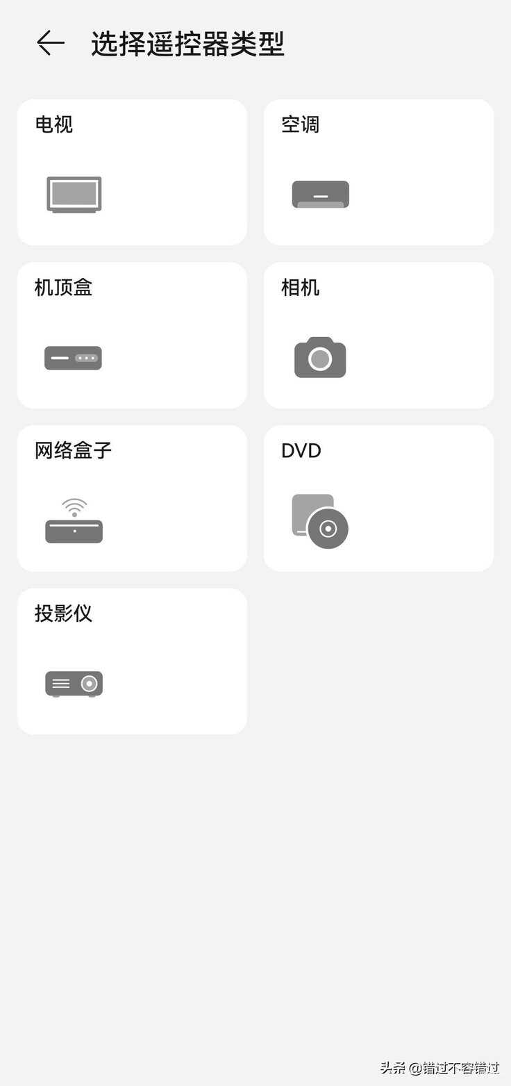 选择要添加的遥控器类型,有七个类型可以选:电视、空调、机顶盒、相机、网络盒子、DVD、投影仪