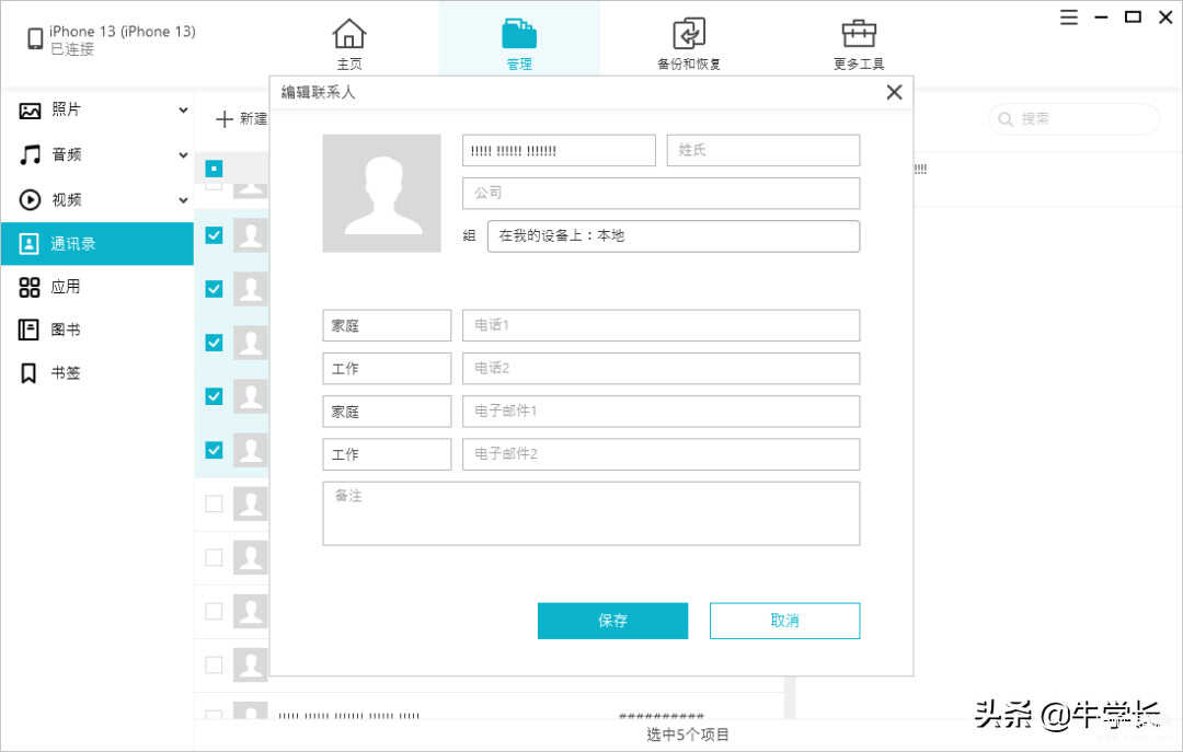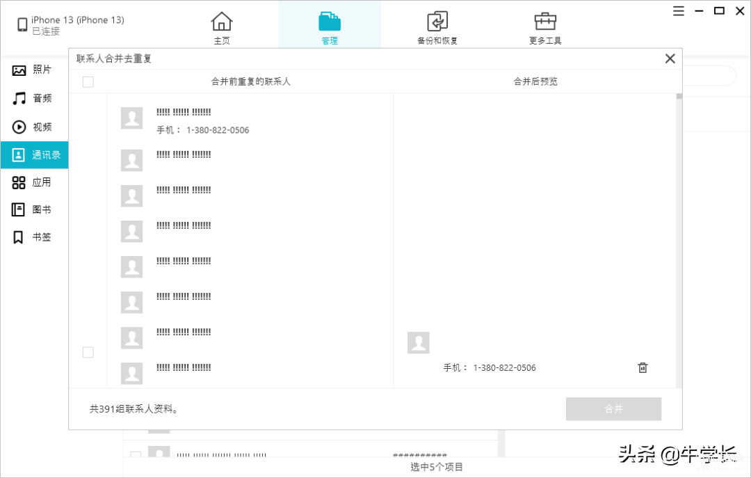想要批量删除通讯录联系人,那么可以试试专业的牛学长苹果数据管理工具,还支持批量删除照片、备忘录、书签、视频等数据。