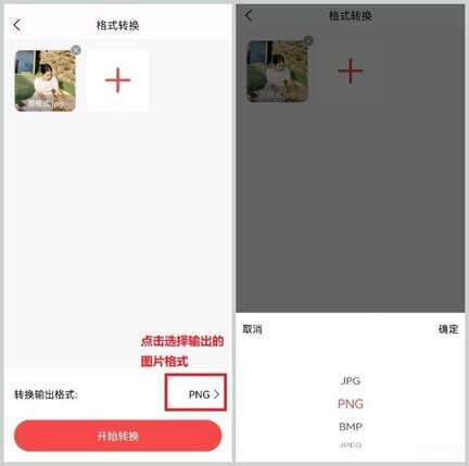 2.导入图片,它同样也支持批量转换格式的功能,点击【+】可以导入多张照片。选择输出格式之后点击【开始转换】就可以了,它支持共计10种格式的图片输出,包括有HEIF、CR2、BMP、WEBP、GIF、BMP、JPEG等。