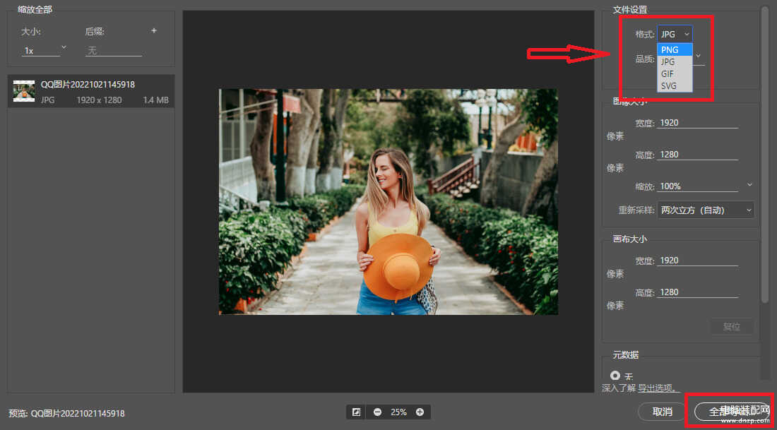 3.在导出的格式中选择需要的格式,再点击【全部导出】就完成啦,它支持4种常见的图片格式哦。