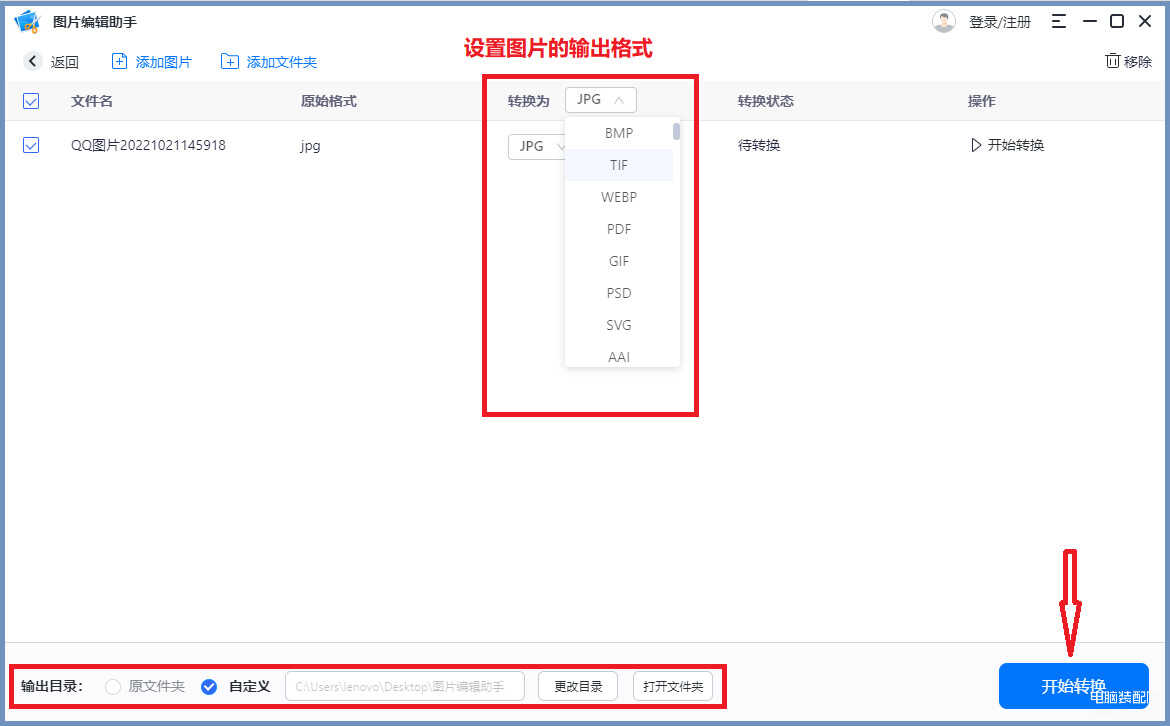 3.点击设置图片的输出格式以及输出的存储目录,点击【开始转换】就可以了。