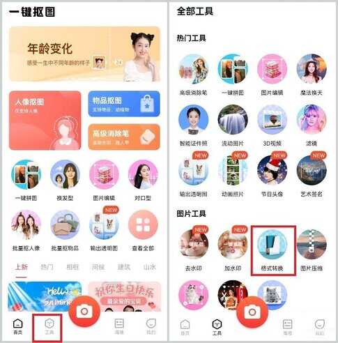 1.手机打开该软件,点击【工具】找到图片工具中的【格式转换】功能。