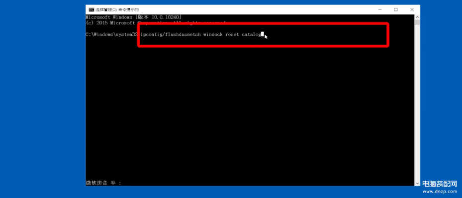2、在命令窗口中,输入ipconfig/flushdns命令,然后在命令下方输入netsh winsock reset catalog的命令,接着回车运行,命令。