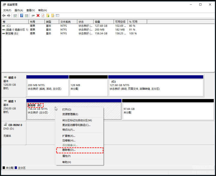 2、在磁盘管理界面,选择你要操作的分区,需要先把分区删除,再把它的空间扩展到C盘上,如图所示。右键需要删除的分区,然后点击删除卷。