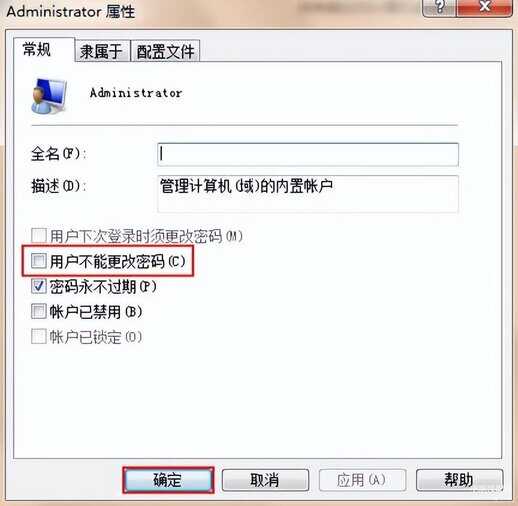3、将下方的“用户不能更改密码”的勾选去掉,点击“确定”按钮,如下图所示: