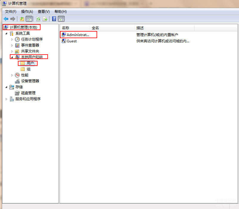 2、依次展开“计算机管理-本地用户和组-用户”,找到administrator帐户并双击,如下图所示: