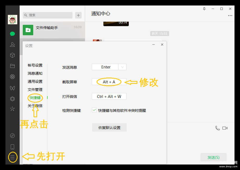 这个快捷键是可以修改了,进入微信的设置面板,找到【快捷键】选项,点击截取屏幕的快捷键,在键盘上设置新的快捷键。