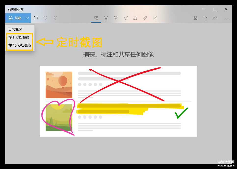 你也可以直接在左下角搜索“截图和草图”工具,然后点击左上方的倒三角图标,选择定时截图。