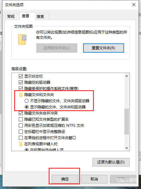 6、在查看界面我们找到隐藏文件和文件夹,把显示隐藏的的文件、文件夹和驱动器勾选就可以了。