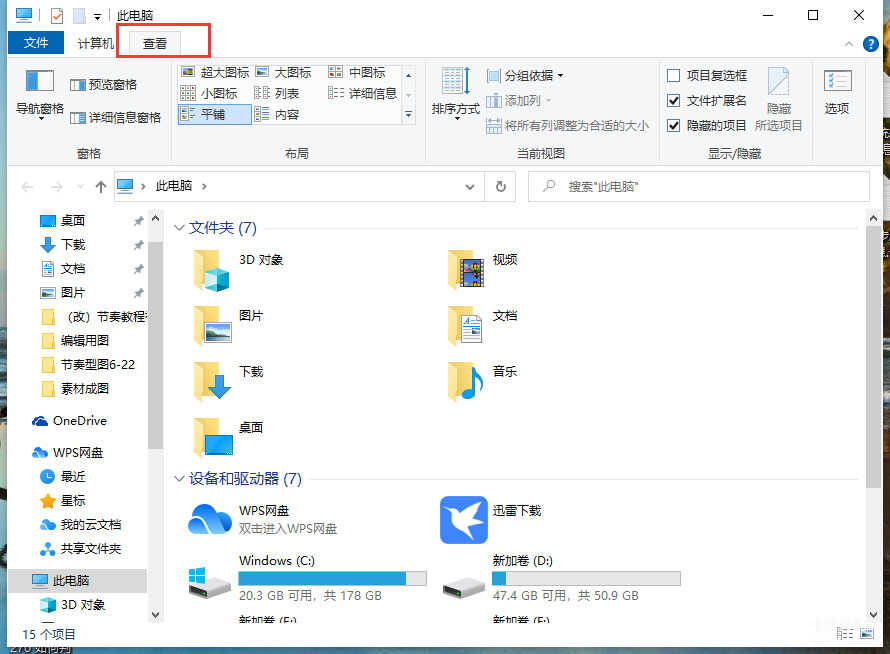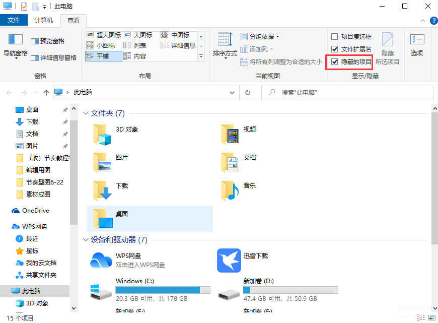 3、在查看界面里,我们点击勾选右侧的隐藏的项目。