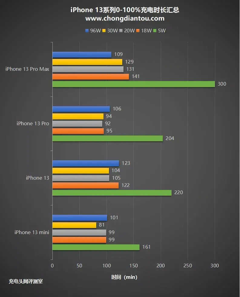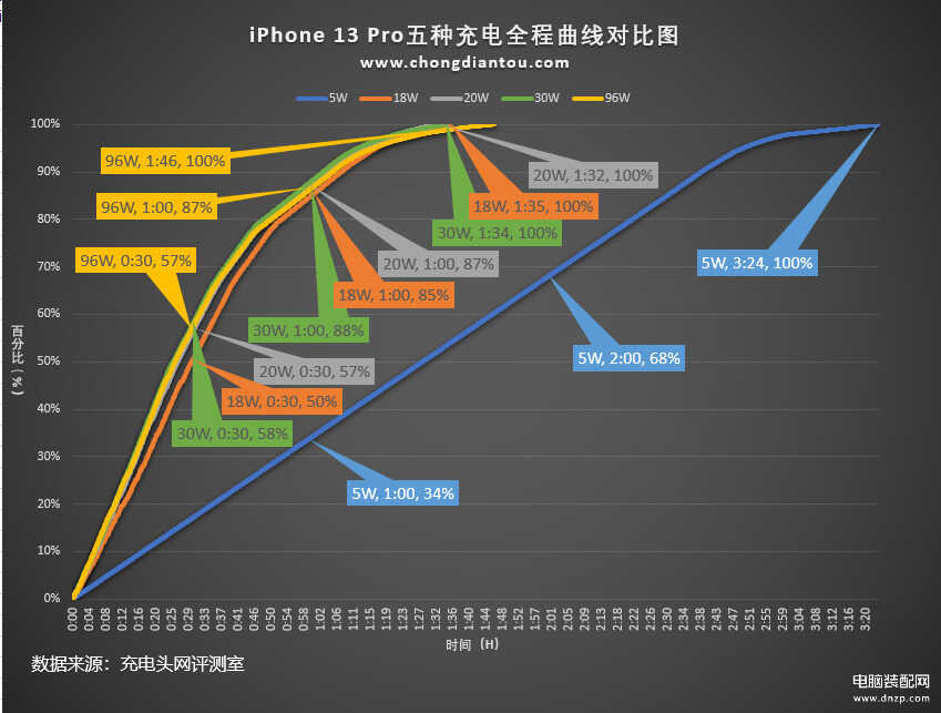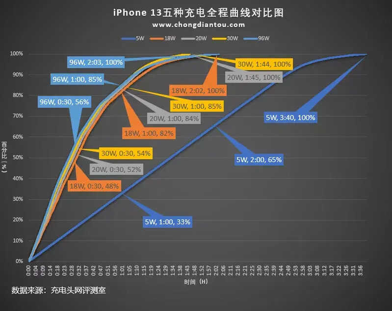 而对于18W、20W、30W以及96W四款充电器而言,应对不同的手机时,其充电总时长也有所差异,不过总体维持在一个相对稳定的状态,选用任何功率端的USB PD快充器,充电速度较5W充电器都会有明显的提升。