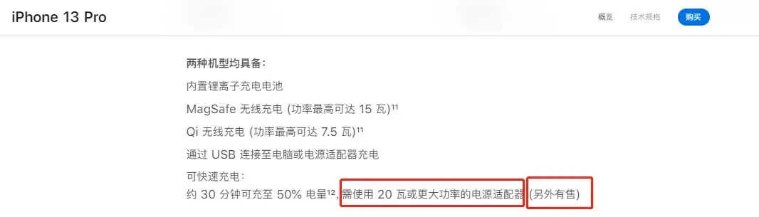 反观手机的充电性能,苹果发布会上确实只字未提,仅在官网描述中提到,搭配20W或者以上功率的充电器,可让手机30分钟充满50%电量。
