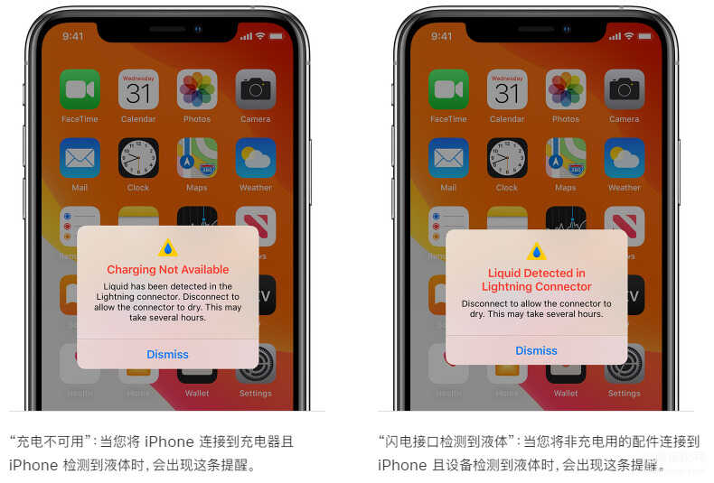 在 iPhone XS 及以上机型当中,苹果为 iPhone 加入了一条新的充电警告,如果闪电端口存在液体,则 iPhone 在充电时,屏幕上就会出现相关的警告。
