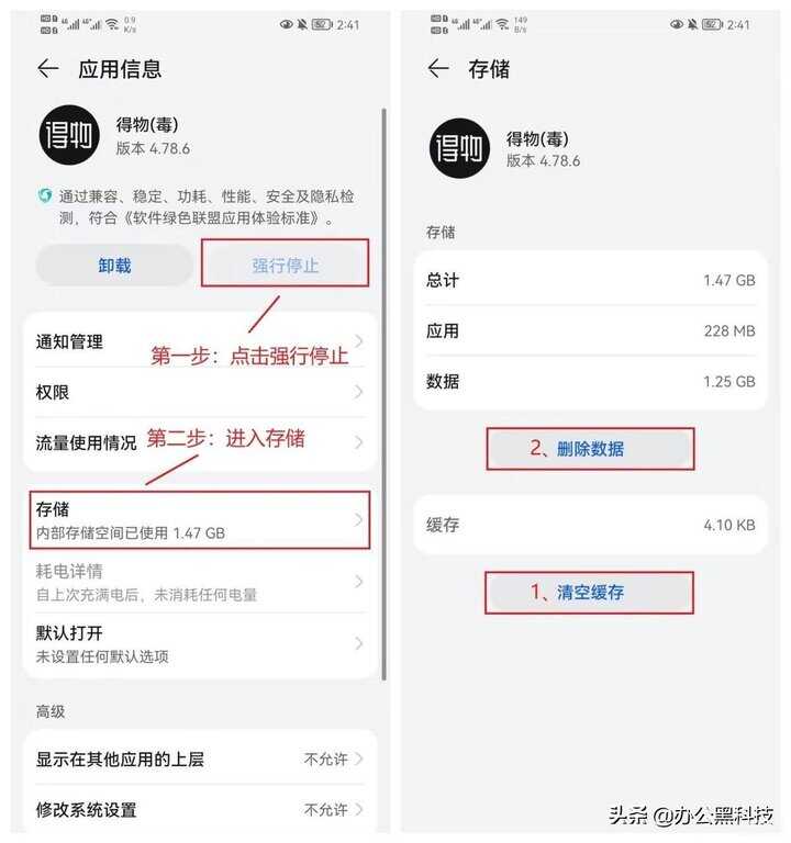 停止应用是为了防止它运行时继续产生缓存垃圾,然后我们点击【存储】,就可以看到应用所占用的内存和缓存垃圾,先点【清除缓存】后再点【删除数据】。(注:谨慎清理)